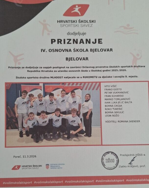 Od 9. do 10. ožujka 2026. godine u Poreču je održano državno natjecanje u rukometu za dječake 7. i 8. razreda osnovnih škola. Na natjecanju je sudjelovala i ekipa IV. osnovne škole Bjelovar koja je ostvarila vrlo dobar rezultat te osvojila 9. mjesto u Republici Hrvatskoj.