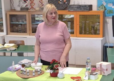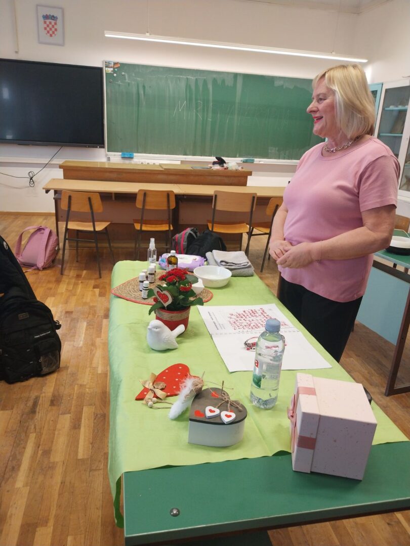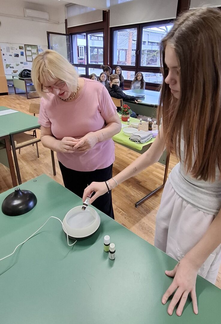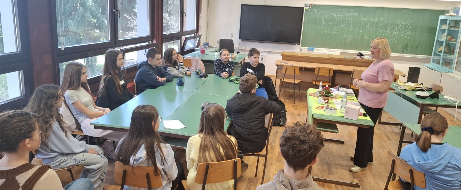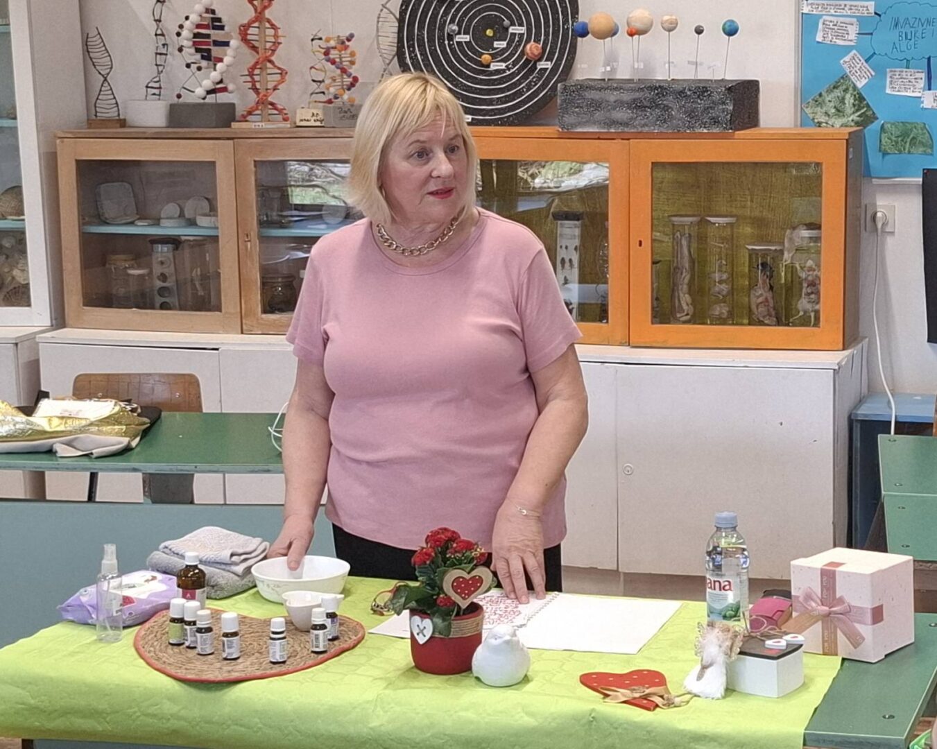Povodom Valentinova u učionici biologije je zavladao poseban, mirisan ugođaj. Na poziv voditeljice učeničke zadruge Mrav, u goste nam je došla aromaterapeutkinja u mirovini, gospođa Emica Tudić, koja je za učenike zadrugare od 5. do 8. razreda održala zanimljivu i edukativnu radionicu o svijetu eteričnih ulja pod nazivom „Mirisna terapija“. U duhu Valentinova, razgovarali smo o tome kako mirisi mogu utjecati na naše raspoloženje, emocije i opće blagostanje. Saznali smo što su eterična ulja, kako se dobivaju, na koji način ih treba pravilno čuvati te kako ih sigurno koristiti u svakodnevnom životu. Posebno nas je razveselilo otkrivanje djelovanja pojedinih eteričnih ulja: naranča za sreću i veselje, limun za umor i manjak energije, bergamot za ublažavanje straha od javnog nastupa, a lavanda i kamilica za smirenje i lakši san. Naučili smo da se eterična ulja mogu koristiti na različite načine, ali uvijek u malim količinama i razrijeđena – za inhalaciju, za masažu, kao oblozi, u kupkama ili za osvježavanje prostora. Uz asistenciju učenika, gospođa Emica demonstrirala je izradu prirodnog spreja za osvježavanje zraka, pripremu obloga koji mogu pomoći kod manjih ozljeda (npr. kad padnemo s bicikla) te je pokazala tehniku opuštajuće masaže šake. Na kraju radionice, svi su učenici (i učiteljice) dobili motivacijske poruke u obliku srca. Ovo mirisno valentinovsko druženje podsjetilo nas je koliko nam je malo potrebno da probudimo pozitivne osjećaje u sebi i osjećamo se dobro. Zahvaljujemo gospođi Emici na toploj i inspirativnoj radionici te se nadamo da će nas posjetiti još puno puta i nastaviti dijeliti svoje znanje, mudrost i pozitivnu energiju.