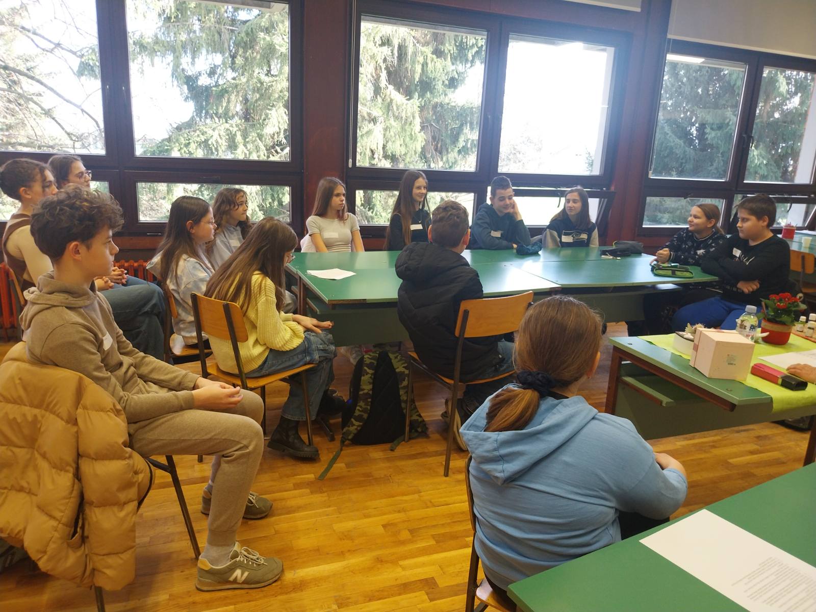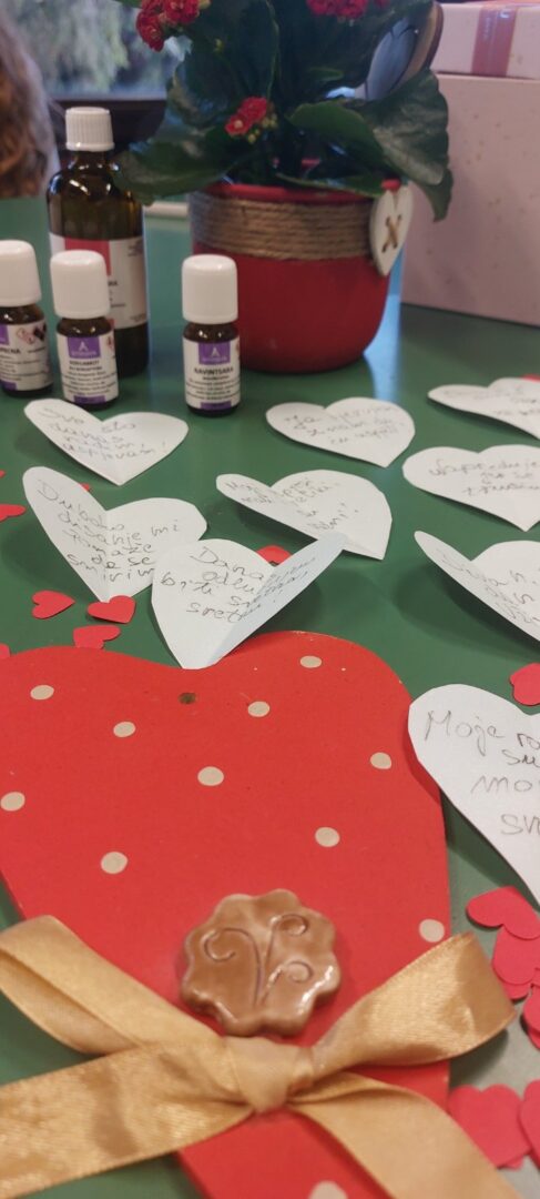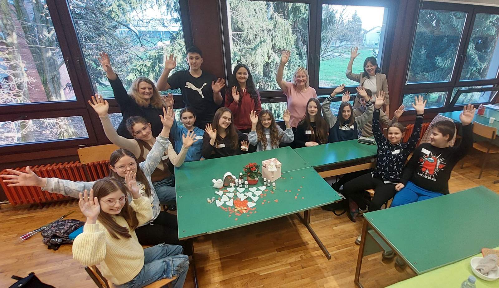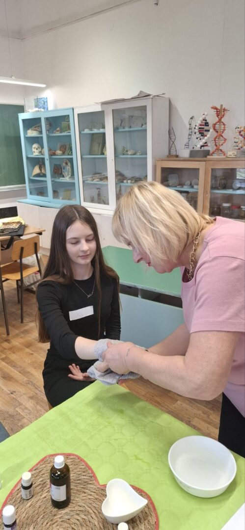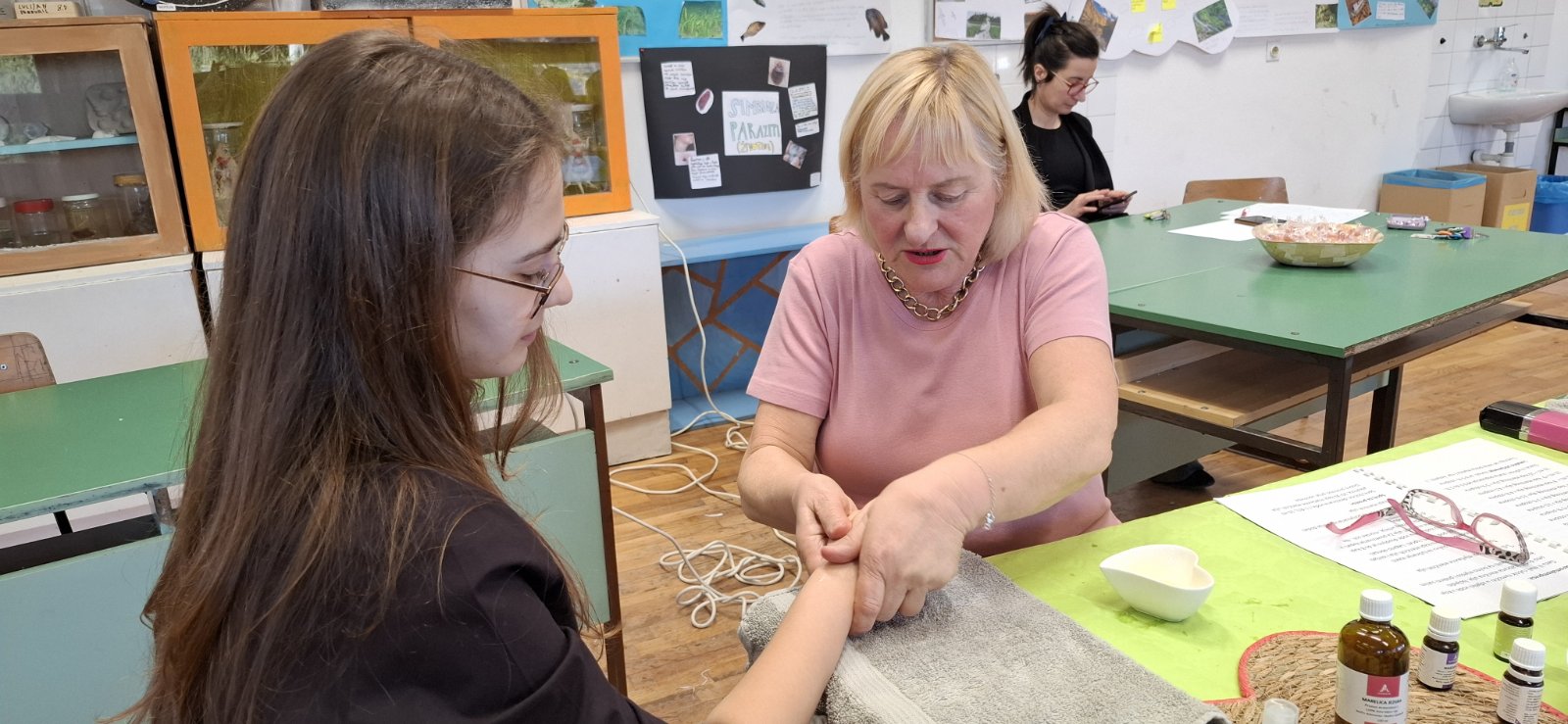 Povodom Valentinova u učionici biologije je zavladao poseban, mirisan ugođaj. Na poziv voditeljice učeničke zadruge Mrav, u goste nam je došla aromaterapeutkinja u mirovini, gospođa Emica Tudić, koja je za učenike zadrugare od 5. do 8. razreda održala zanimljivu i edukativnu radionicu o svijetu eteričnih ulja pod nazivom „Mirisna terapija“. U duhu Valentinova, razgovarali smo o tome kako mirisi mogu utjecati na naše raspoloženje, emocije i opće blagostanje. Saznali smo što su eterična ulja, kako se dobivaju, na koji način ih treba pravilno čuvati te kako ih sigurno koristiti u svakodnevnom životu. Posebno nas je razveselilo otkrivanje djelovanja pojedinih eteričnih ulja: naranča za sreću i veselje, limun za umor i manjak energije, bergamot za ublažavanje straha od javnog nastupa, a lavanda i kamilica za smirenje i lakši san. Naučili smo da se eterična ulja mogu koristiti na različite načine, ali uvijek u malim količinama i razrijeđena – za inhalaciju, za masažu, kao oblozi, u kupkama ili za osvježavanje prostora. Uz asistenciju učenika, gospođa Emica demonstrirala je izradu prirodnog spreja za osvježavanje zraka, pripremu obloga koji mogu pomoći kod manjih ozljeda (npr. kad padnemo s bicikla) te je pokazala tehniku opuštajuće masaže šake. Na kraju radionice, svi su učenici (i učiteljice) dobili motivacijske poruke u obliku srca. Ovo mirisno valentinovsko druženje podsjetilo nas je koliko nam je malo potrebno da probudimo pozitivne osjećaje u sebi i osjećamo se dobro. Zahvaljujemo gospođi Emici na toploj i inspirativnoj radionici te se nadamo da će nas posjetiti još puno puta i nastaviti dijeliti svoje znanje, mudrost i pozitivnu energiju.