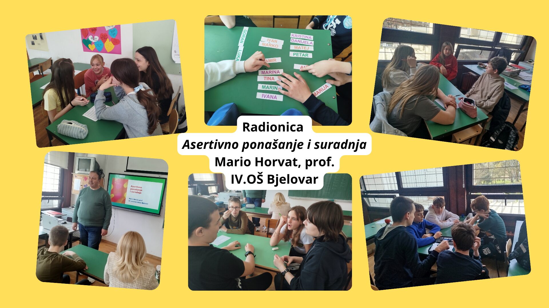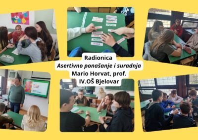 Pedagog Mario Horvat održao je radionicu „Asertivno ponašanje i suradnja“ za učenike 6. razreda. Učenici su imali priliku upoznati razlike između agresivnog, pasivnog i asertivnog ponašanja te promišljati o načinima kvalitetnije komunikacije u svakodnevnim situacijama. Radionica je bila interaktivna – učenici su sudjelovali u individualnim zadacima i radu u skupinama, razmjenjivali mišljenja i aktivno se uključivali u raspravu. Poseban naglasak stavljen je na razvoj suradnje i međusobnog uvažavanja, a učenici su pokazali velik interes i angažiranost tijekom cijelog susreta.