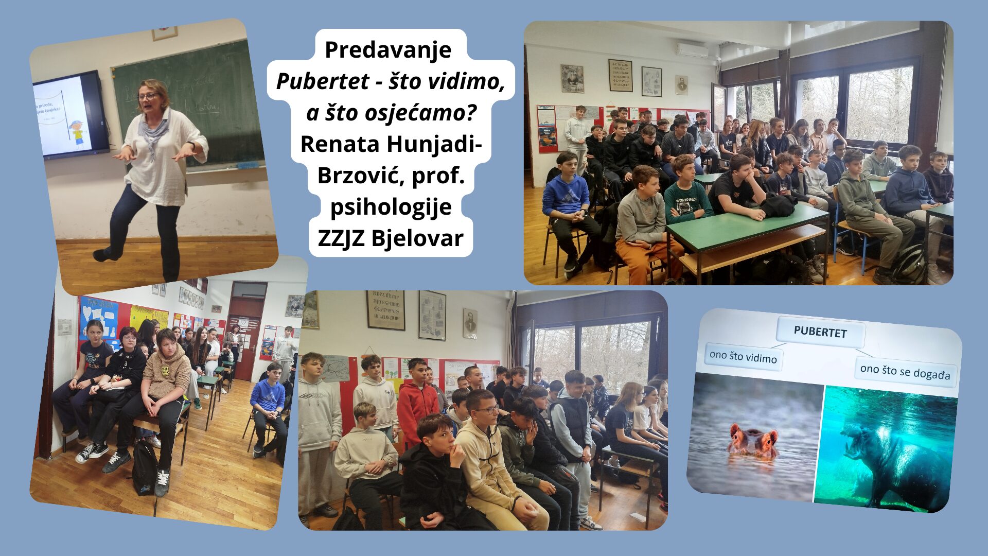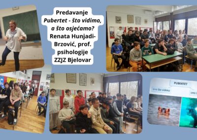 Za učenike 7. razreda organizirano je predavanje „Pubertet – što vidimo, a što osjećamo?“, koje je održala psihologinja Renata Hunjadi-Brzović iz Zavoda za javno zdravstvo Bjelovar. Predavanje je bilo izuzetno zanimljivo, jasno i vrlo pristupačno učenicima, a predavačica je na topao i razumljiv način približila temu puberteta. Obuhvatila je fizičke i emocionalne promjene te učenicima pomogla da bolje razumiju sebe i svoje reakcije u tom razdoblju. Učenici su pažljivo pratili izlaganje, rado sudjelovali i pokazali velik interes za temu.